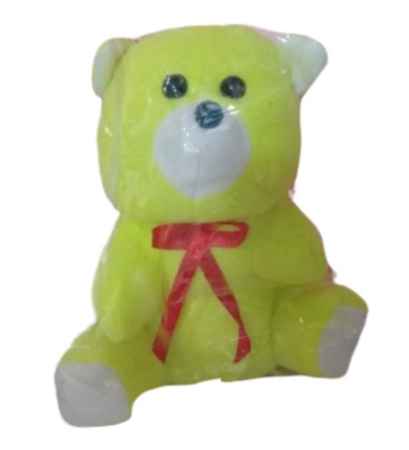 Bright Neon Yellow Teddy Bear with Red Satin Bow – Small Plushie