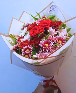 Celebrate the moments that matter with a bouquet designed to speak from the heart. This arrangement blends the timeless passion of deep red roses with the playful charm of pink-tipped daisies, creating a visual harmony of love and joy. Whether it’s an anniversary, a heartfelt “thank you,” or just because, these fresh blooms carry a message of warmth and affection that words often can’t capture.
