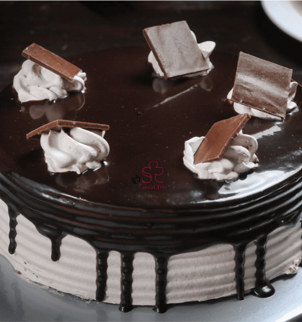 A classic showstopper featuring thick layers of light chocolate cream topped with a dramatic dark chocolate drip. Decorated with airy cream swirls and premium chocolate squares for a modern, sophisticated look.