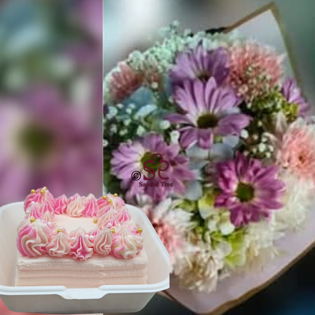 A lovely mix of fresh purple daisies and white baby’s breath flowers, paired with a cute pink bento cake. Perfect for birthdays or just to say “thinking of you.