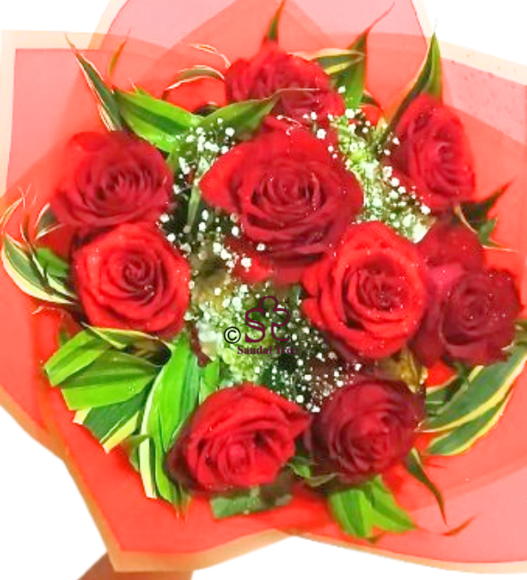 A bold and passionate collection of deep red roses nestled among lush greenery and white waxflowers. Encased in a vibrant crimson wrap, this bouquet makes a powerful statement of love, respect, and timeless admiration.
