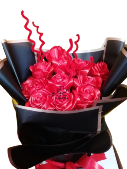 Timeless elegance meets modern flair. This handcrafted bouquet features exquisite, high-shine red ribbon roses nestled in a dramatic midnight-black wrap with silver-edged accents. Topped with whimsical, wavy decorative flourishes, it’s the perfect “forever” gift for anniversaries, Valentine’s Day, or just to say “I love you” with a touch of bold sophistication. Unlike real flowers, these blooms stay vibrant forever.