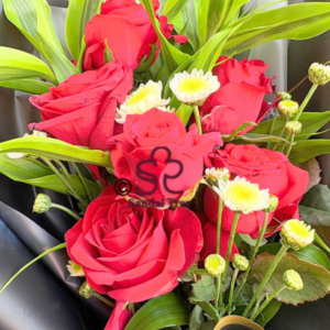 Make a bold statement with our Midnight Crimson Rose Bouquet. Featuring hand-picked, velvety red roses accented by delicate white blossoms and vibrant greenery, this arrangement is elegantly encased in a signature matte black and gold wrap. It’s the perfect choice for anniversaries, romantic gestures, or a sophisticated gift for someone special.