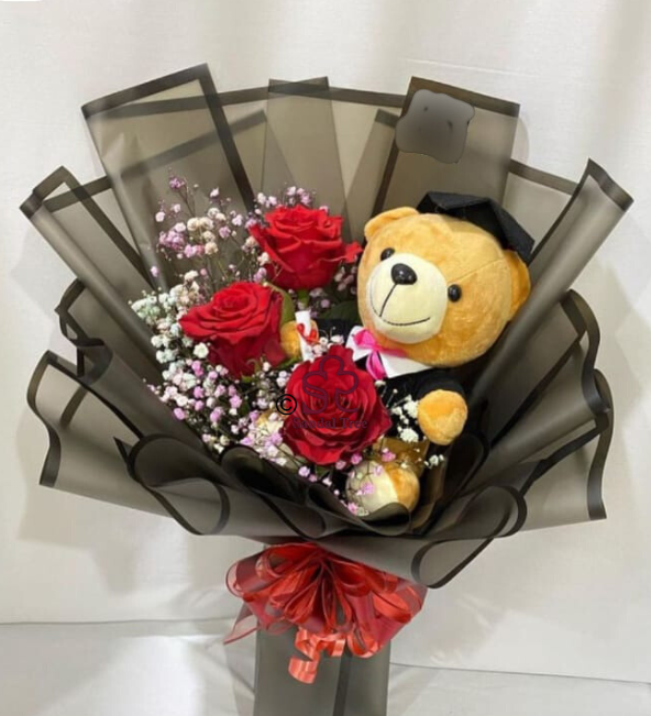 A sophisticated arrangement featuring deep red roses and delicate baby’s breath, paired with a classic graduation teddy bear. Wrapped in elegant translucent charcoal paper for a modern, high-contrast look.