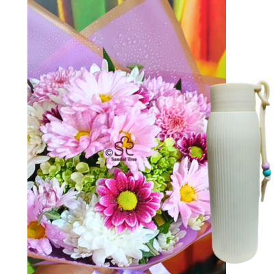 A calming mix of pastel blooms, a cream bottle, and a sweet bento cake to celebrate her peace.