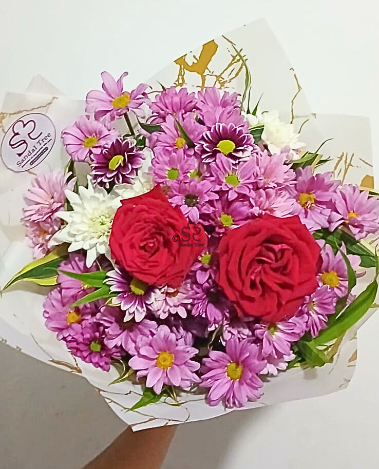 Elegant pink chrysanthemums paired with classic red roses, wrapped beautifully for sweet moments and gentle affection.