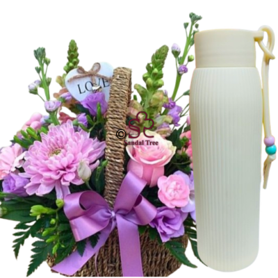 Elegant pastel pink roses and lavender mums paired with a sophisticated cream-toned ribbed bottle.
