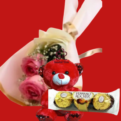 A charming pair of soft pink roses with baby’s breath, a glittering red plush bear, and a 3-pack of Ferrero Rocher.
