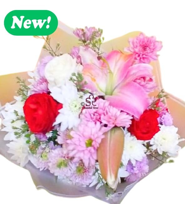 Bring the charm of a sun-drenched garden indoors. This vibrant mix blends the bold passion of red roses with the gentle sweetness of pink chrysanthemums and a striking focal lily. Arranged in a classic, flared wrap, this bouquet celebrates the beautiful contrasts of life, making it the ideal gift for birthdays, thank-yous, or “just because” moments.
