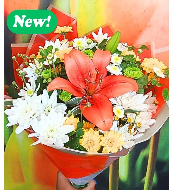 For moments that demand extraordinary beauty. This magnificent, curated arrangement makes a statement with a flawless, oversized Coral Asiatic Lily, surrounded by a pristine tapestry of pure white and butter-yellow chrysanthemums. A masterpiece of symmetry and color, this bouquet is meticulously wrapped to exude unparalleled sophistication and timeless luxury. A true VIP experience.
